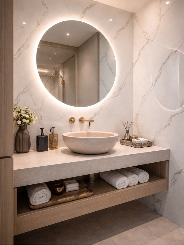 A magasfényű, tükörsima felület kiemeli a márvány erezetének finom részleteit, és különleges mélységet kölcsönöz a falaknak, miközben a fényvisszaverődés tágasabbá teszi a teret. A 3 mm vastag, 1220×2850 mm méretű, panelek lehetővé teszik nagy, homogén felületek gyors és egyszerű kialakítását, minimális illesztésekkel.